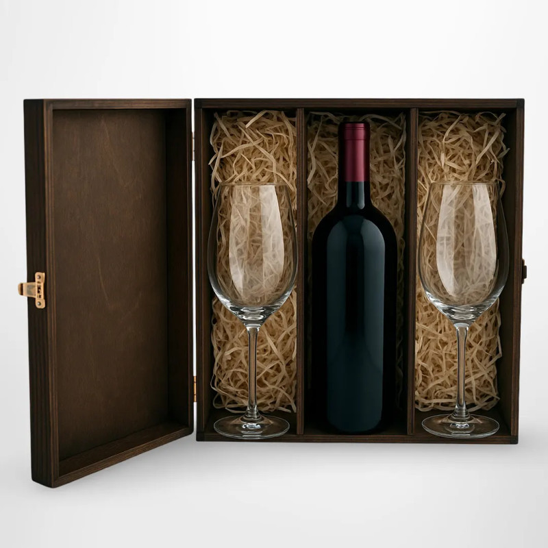 Elegantní dárková sada, která okouzlí svou kvalitou zpracování. Dřevěná krabička z přírodního borovicového dřeva ukrývá dvě stylové sklenice na víno, vyrobené z vysoce kvalitního skla se zvýšenou odolností proti poškození. Jejich klasický tvar – dlouhá nožka a široká číše – zajišťuje, že jsou ideální pro degustaci oblíbených vín. Skvělý tip na dárek pro milovníky dobrého vkusu a estetiky. Produkt se prodává bez nápojů, které jsou na fotografiích vyobrazeny pouze pro ilustraci.